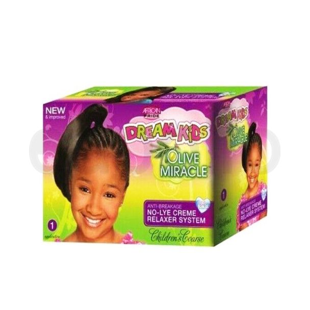 African Pride Dream Kids Olive Miracle Relaxer Kit is formulated exclusively for children’s delicate hair and sensitive scalp, Dream Kids Anti-Breakage No-Lye Relaxer System Olive Miracle formula leaves hair softer, silkier and more manageable than ever before.Â