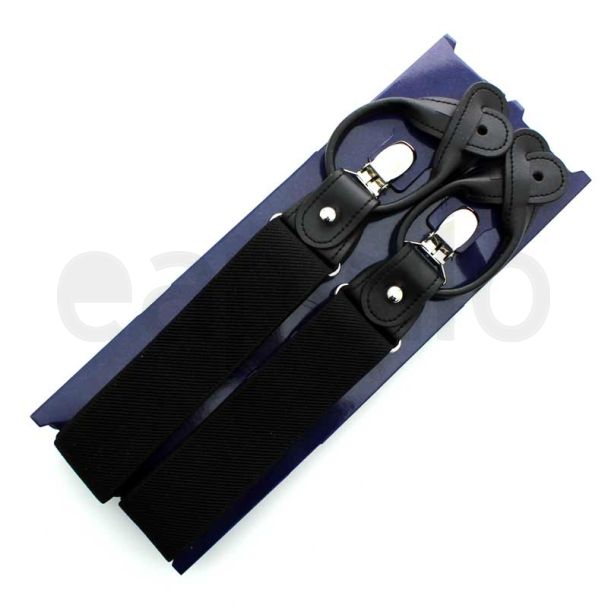 Men's 35mm black fabric and faux leather braces individually packed in a presentation box.