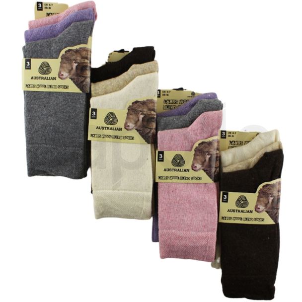 Ladies Australian Lambs Wool Blend Ankle Socks - Assorted (3 Pack) is available to buy in increments of 4