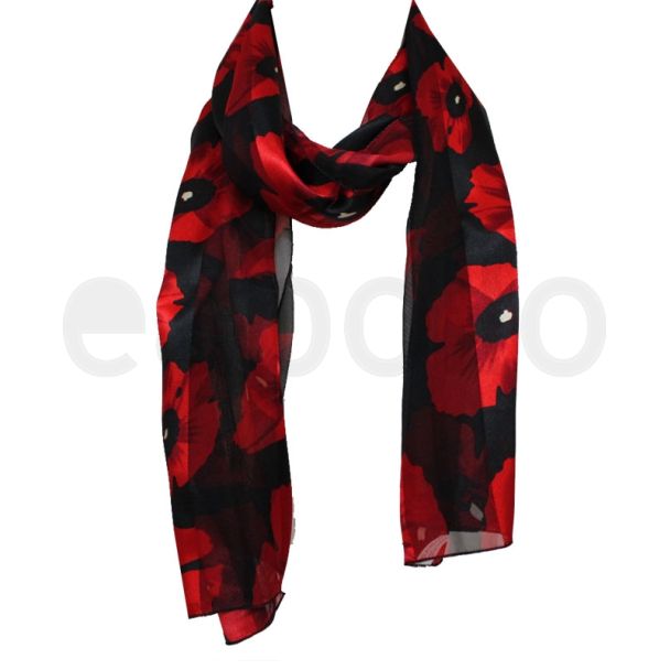 Ladies Satin Scarf Poppy Flower Design - Black is available to buy in increments of 3