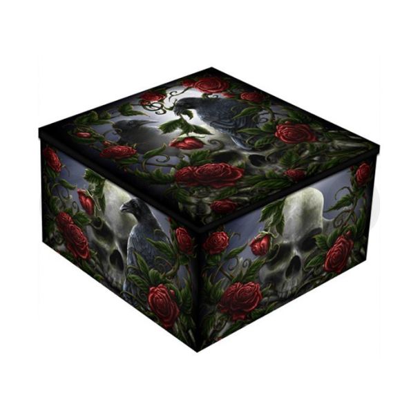 10cm × 10cm box made of compisite wood, covered in a printed material featuring artwork from Linda M. Jones, and lined with a velvet effect material. Inside it has a 7cm × 7cm mirror attached to the lid.