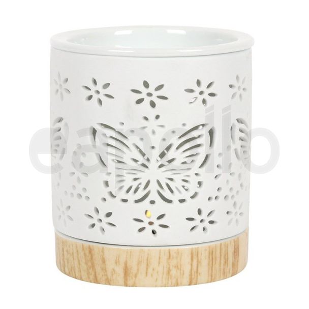 This lovely matte ceramic oil burner has a pretty cut-out butterfly detail so that when a tealight is lit and placed within it lights up the pattern