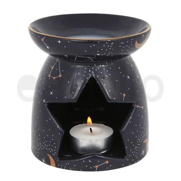 This stunning oil burner and wax warmer features an all-over celestial design with shining gold moon accents.