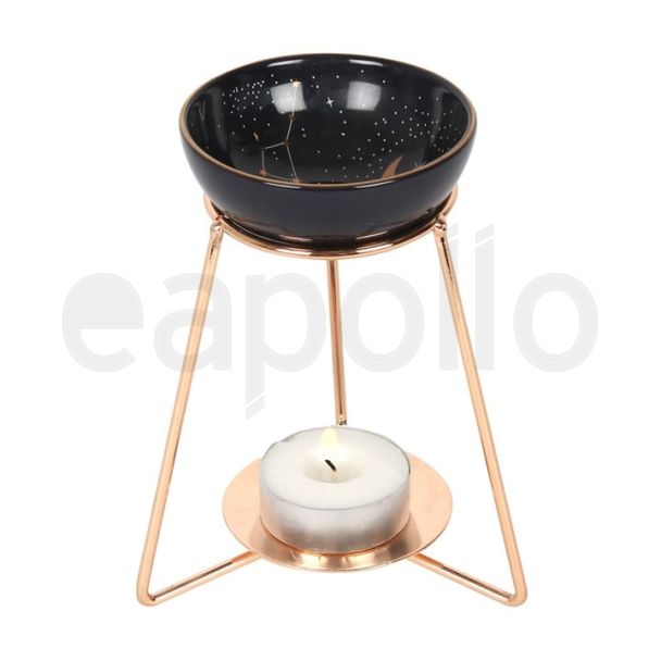 This unique oil burner and wax warmer includes a stunning ceramic dish featuring gold celestial accents and a matching gold metal base.
