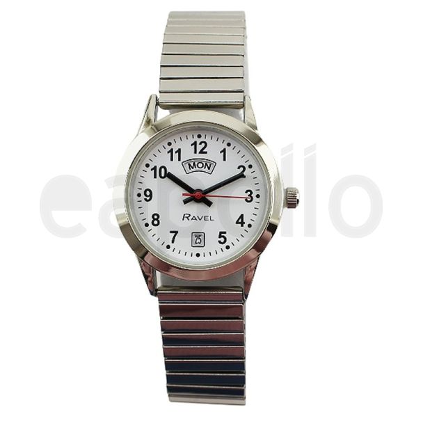 Ravel Ladies Metal Expander Watch With Date & Day Display - Silver/White