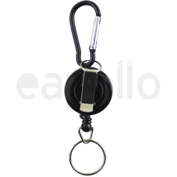 A sleek and practical retractable keyring in black, perfect for keeping keys, ID cards, or small tools easily accessible. The retractable mechanism ensures convenience and prevents loss while on the move.