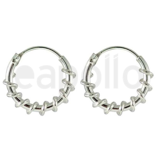 Sterling Silver plain hoop earrings with a fine twist wrapped around the hoop.