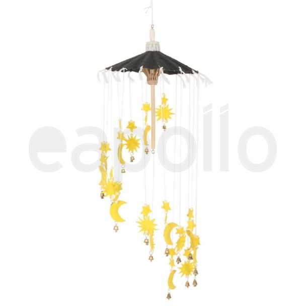 This SAA mobile features a celestial sun, star and moon design with gold bell accents.